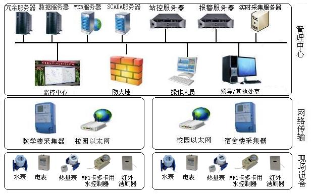 系統(tǒng)概述 基于物聯(lián)網(wǎng)、大數(shù)據(jù)、云計算及移動互聯(lián)網(wǎng)等新興技術(shù)的快速發(fā)展和不斷融合,新天科技順應市場潮流,在自身現(xiàn)有的技術(shù)基礎上,開拓性地開發(fā)推出針對校園中電量消耗、燃料消耗、熱量消耗、冷量消耗及水資源消耗的數(shù)據(jù)采集、傳輸及統(tǒng)計分析的智慧校園節(jié)能監(jiān)管系統(tǒng)。該系統(tǒng)使學校能夠有效建立節(jié)能工作的長久機制,推進和深化節(jié)約型校園的建設,實現(xiàn)校園建筑設施能源高效利用和管理系統(tǒng)的建設。 智慧校園節(jié)能監(jiān)管系統(tǒng)由計量表具、數(shù)據(jù)采集及轉(zhuǎn)換裝置、數(shù)據(jù)傳輸網(wǎng)絡、數(shù)據(jù)中轉(zhuǎn)站、數(shù)據(jù)服務器、管理軟件組成。該系統(tǒng)主要用于對學校建筑能耗進行分類分項計量、數(shù)據(jù)統(tǒng)計、數(shù)據(jù)分析、節(jié)能分析及節(jié)能指標管理。系統(tǒng)具備能耗數(shù)據(jù)實時采集和通訊、遠程傳輸、自動分類統(tǒng)計、數(shù)據(jù)分析、指標比對、圖表顯示、報表管理、數(shù)據(jù)儲存、故障自動上傳等功能,為校園節(jié)能建設提供管理依據(jù)。